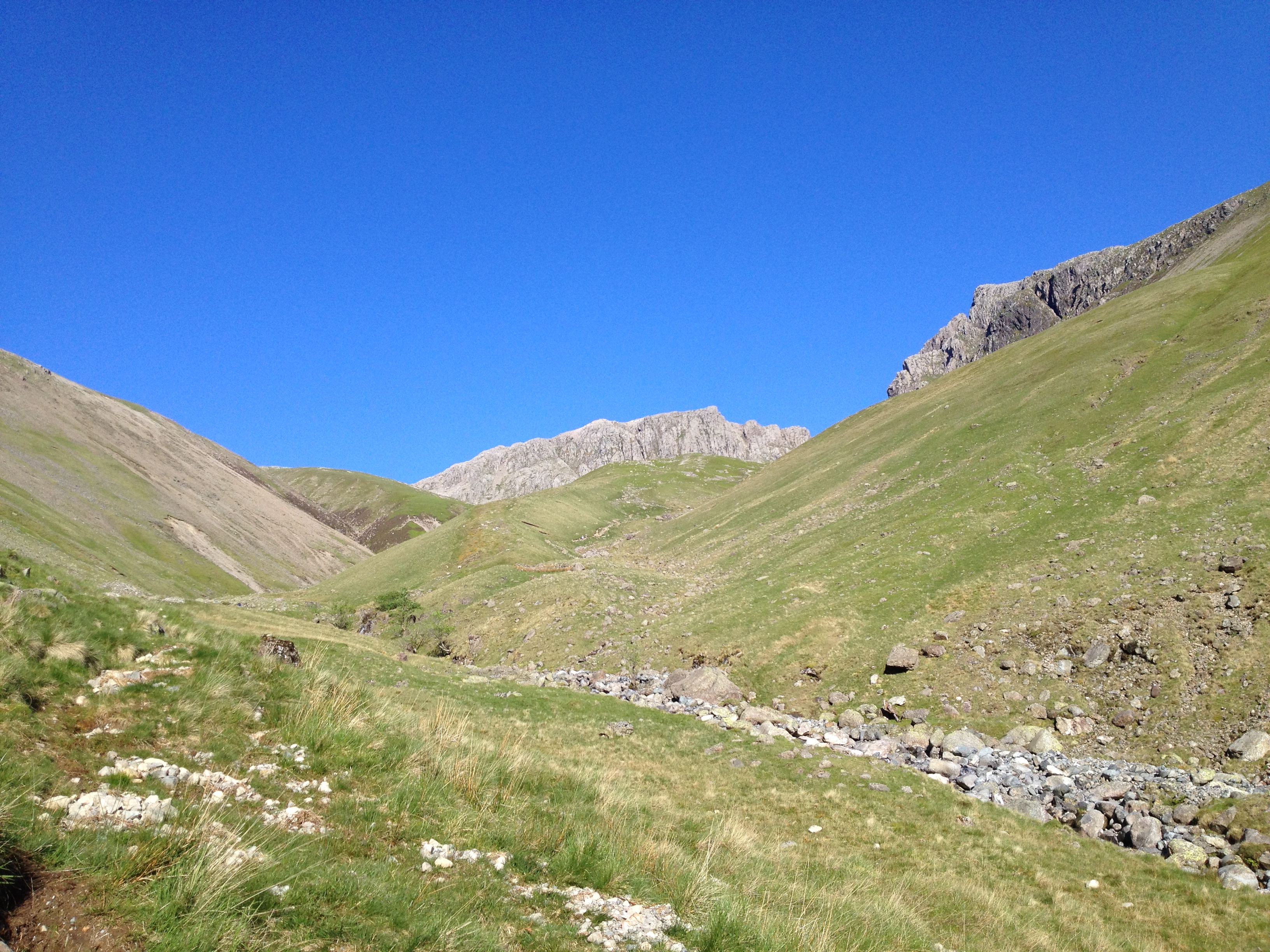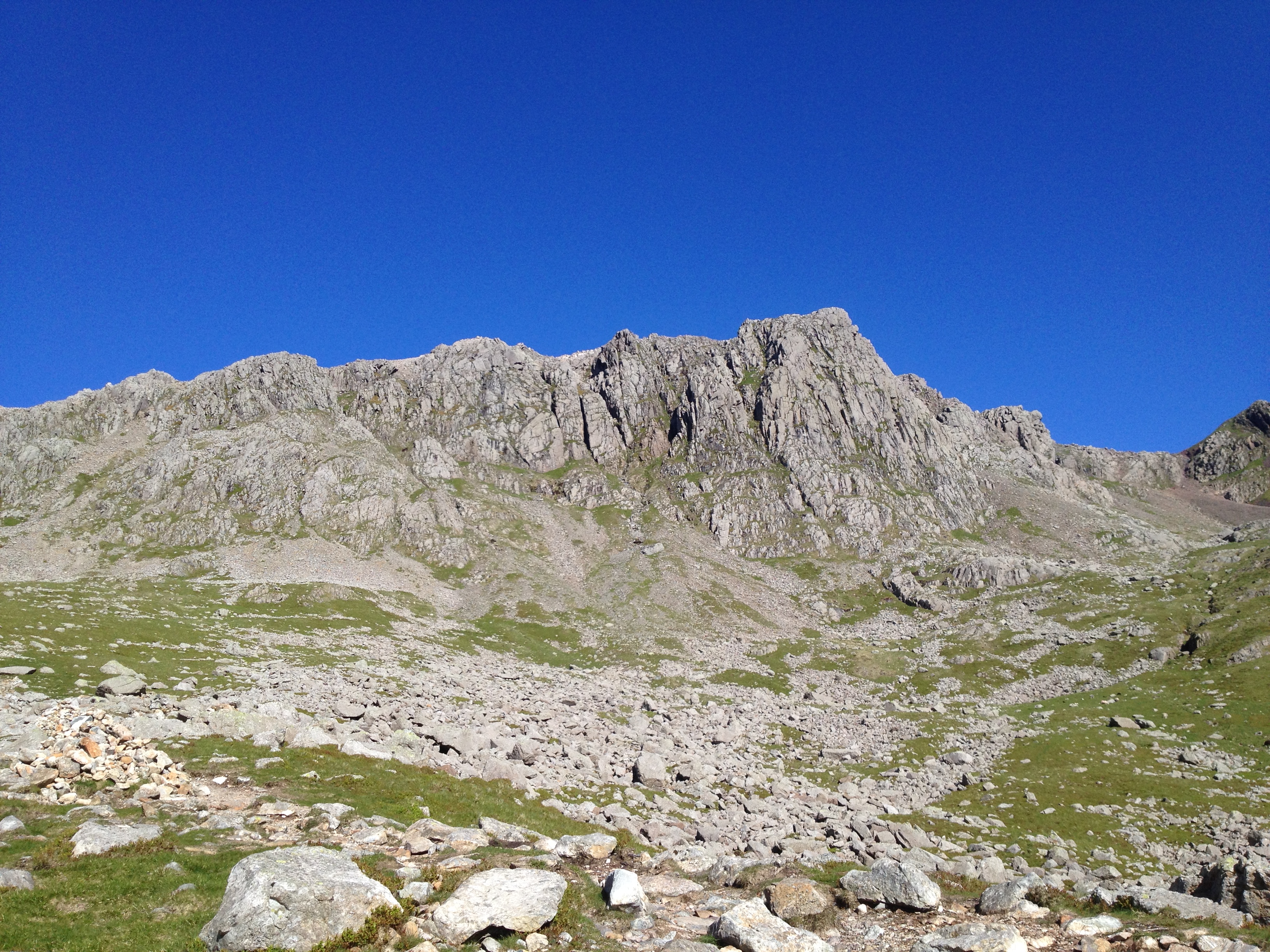 Looking back up Lingmell Gill to Pikes Crag and the Pulpit Rock pinnacle