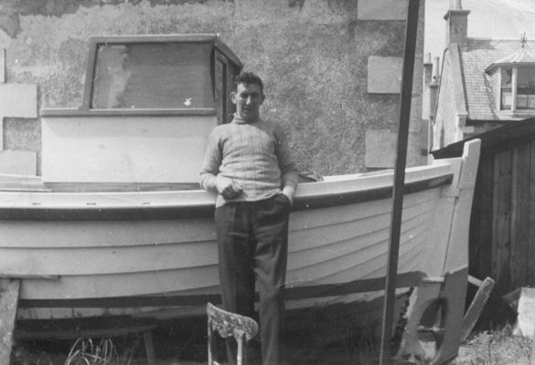 James Flett Wood visits the boat built by William Lewis Pirie in the back yard of 28 Seafield Street, Portknockie